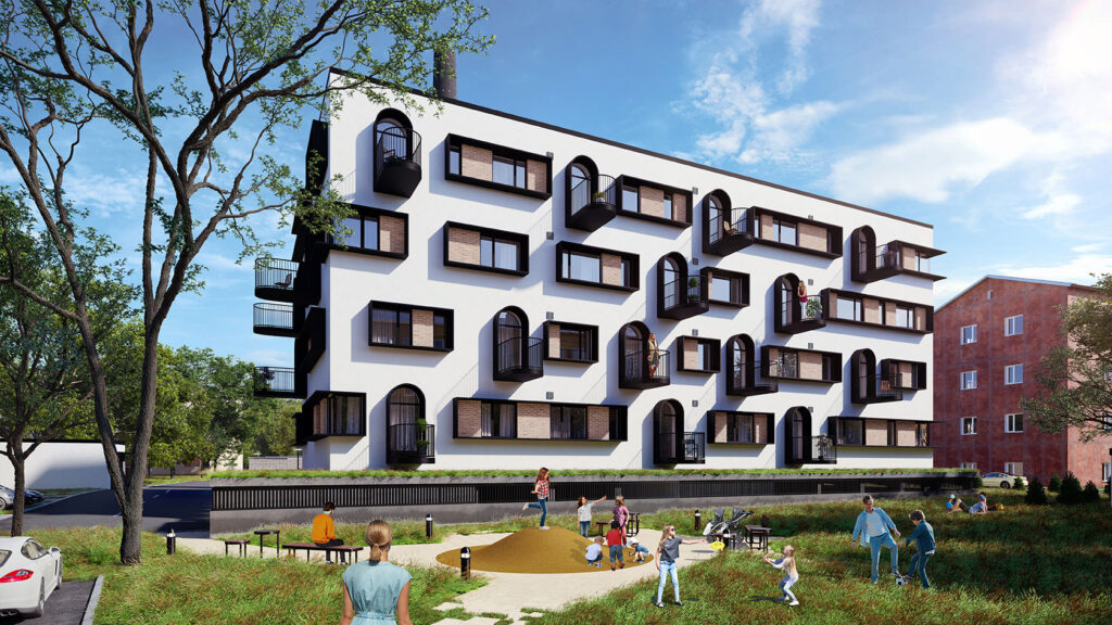 Korterelamu Kuperjanovi 8, Tartu. Omanäolisele kortermajale sai loodud korterite siseviimistluspaketid. Klientidele parema ettekujutuse loomiseks valmisid tehtud valikute põhjal stendid.